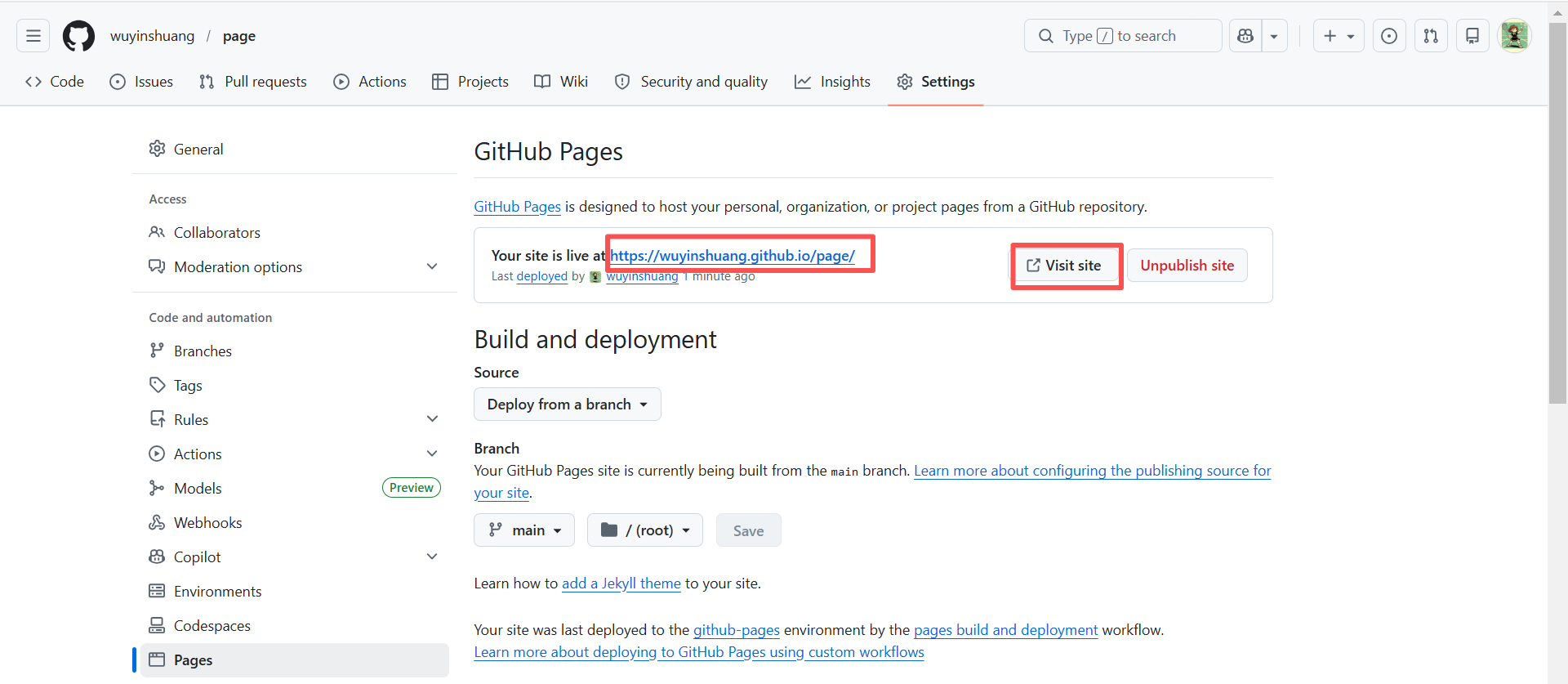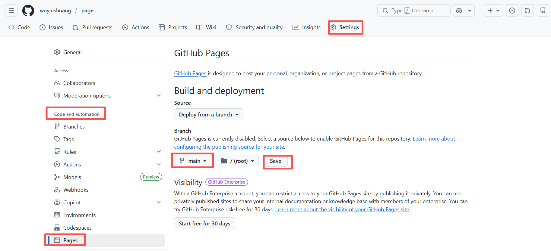 4.1 回到刚才创建的Repository页面,点击”Settings”,在左边菜单“Code and automation” 下找到“Pages”,然后在Branch 选项中选择”main”,最后点击“Save”。
