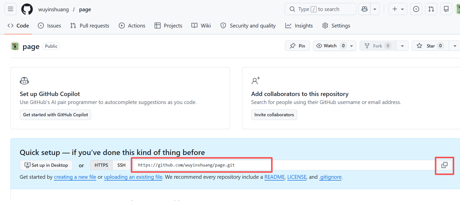 2.1 回到github个人首页,找到刚刚创建的新仓库地址并复制。