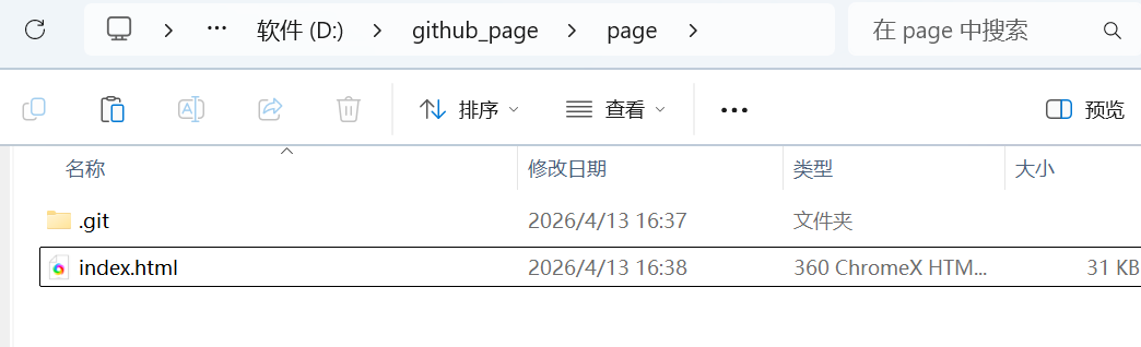 3.1 在刚刚本地克隆后出现的page文件夹中新建一个index.html(这个文件应该是跟.git在同一目录级别),自己写个人主页内容: