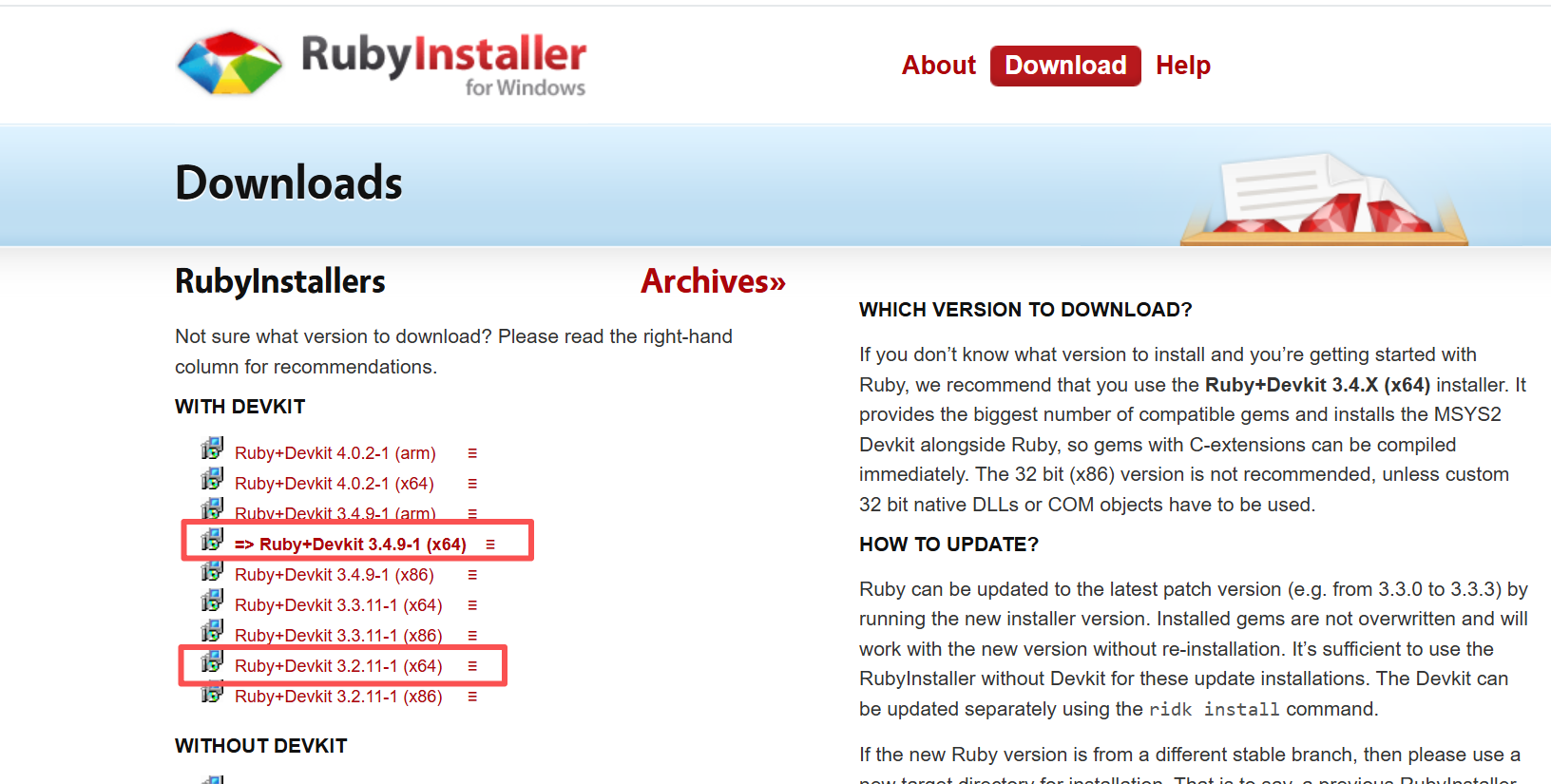 windows用户下载安装RubyInstaller,安装时务必勾选 “Add Ruby executables to your PATH”。推荐安装3.2.11(x64),博主一开始安装的是3.4.9(x64),但是实际过程中会报错(下面有介绍)。