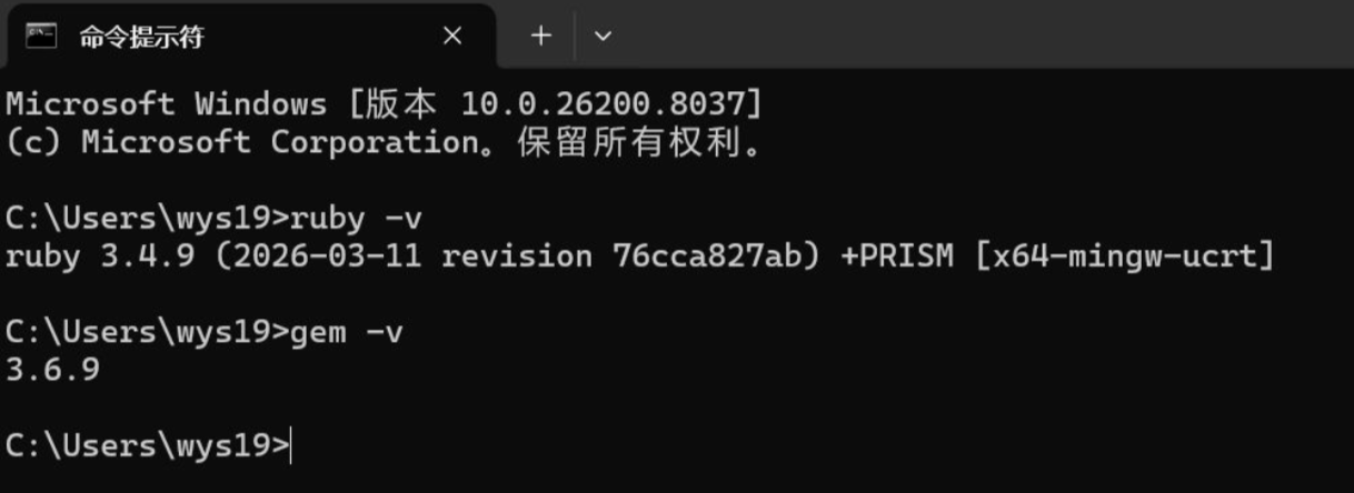 #如果能看到版本号(比如 `ruby 3.4.9p-1`、`gem 3.5.x`),说明安装成功。