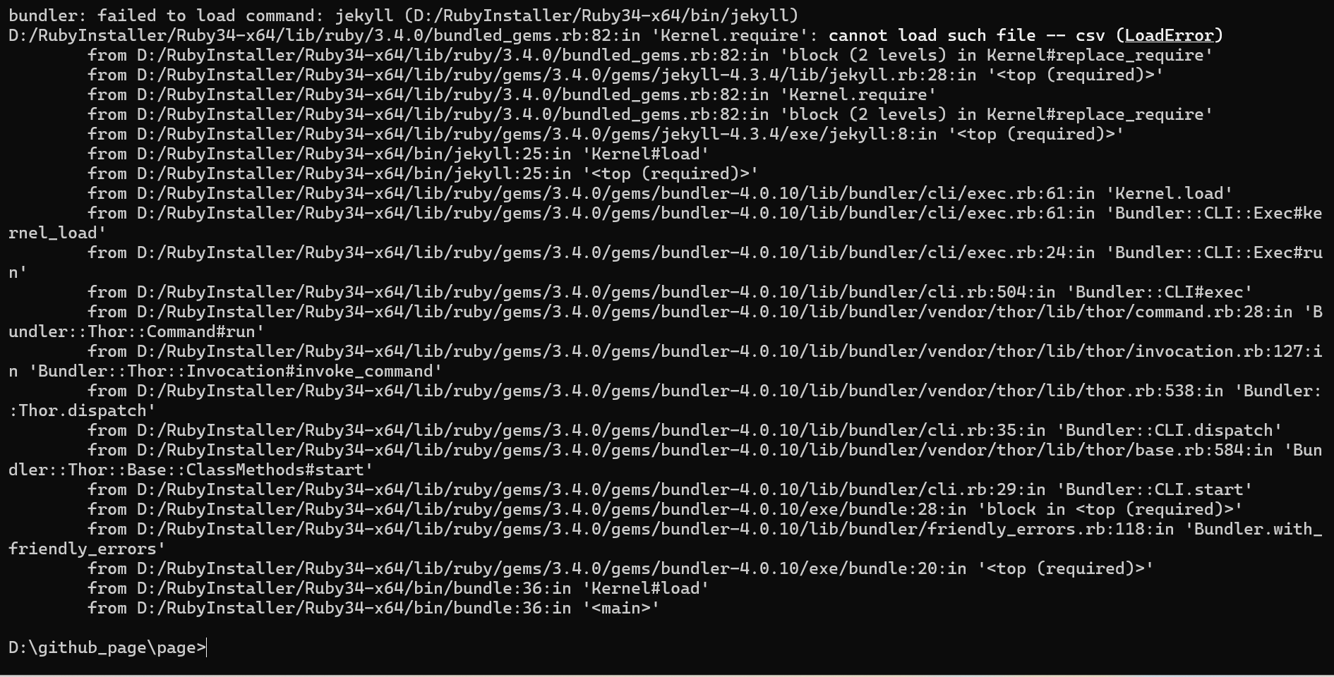 从报错日志来看,核心问题是 Ruby 3.4.0 之后 csv库不再是默认 gem,而 Jekyll 依赖了它,但我的环境里没有显式安装 csvgem。