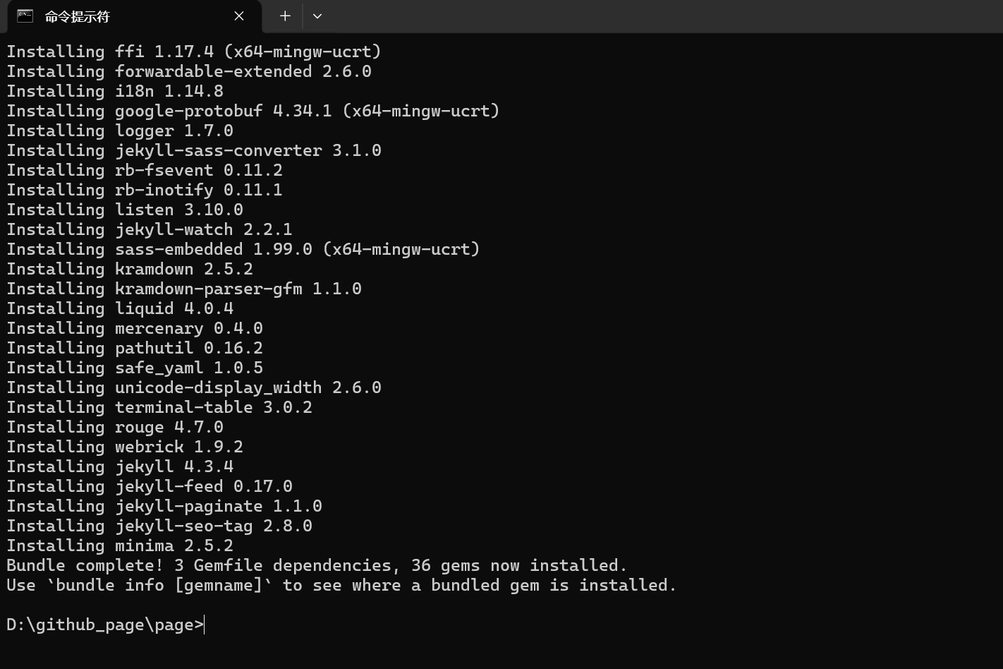在项目根目录执行:bundle install, 这会下载并安装 Gemfile中指定的所有插件(包括 Jekyll、Minima、jekyll-paginate)。